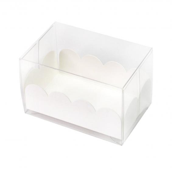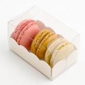 A trendy way to present macarons, featuring a satin white scalloped card insert and a clear plastic box to show off baked goods.