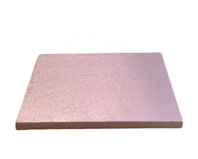 A cake drum is the strongest type of Cake Board. It has a bonded fibre board inner which is covered on the top and sides with a textured, rose gold coloured foil and with white paper on the base. The finished Cake Board is approximately 0.5" (13mm) thick, with a 12" square top. Colours may vary.
