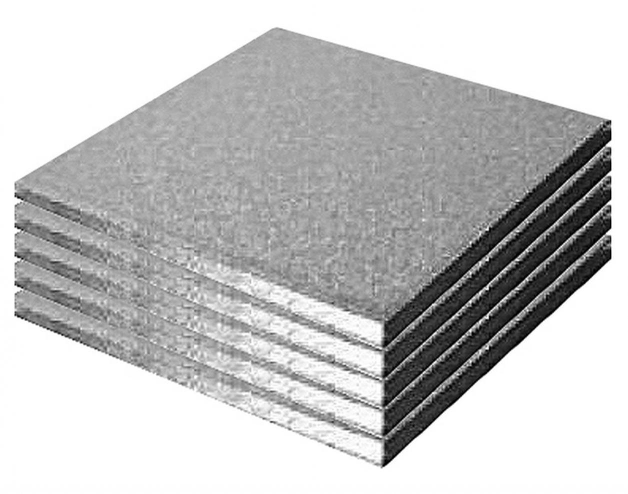 A cake drum is the strongest type of Cake Board. It has a bonded fibre board inner which is covered on the top and sides with a textured, silver coloured foil and with white paper on the base. The finished Cake Board is approximately 0.5" (13mm) thick, with a 18" square top. These Cake Boards are supplied shrink wrapped in packs of 5, please note that the Cake Boards are not individually wrapped.