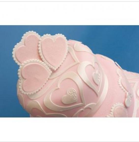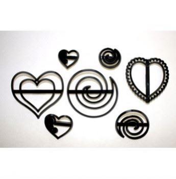 Hearts and Swirls Cutter Set. This is a beautiful cutter set from Patchwork Cutters featuring 4 different Heart cutters and 3 different Swirl cutters. The set is superb for all sorts of modern and traditional celebration cakes from engagement to wedding, anniversary to birthday. The 7 basic heart and swirl cutters can be used in many different ways, cut out small hearts for side decorations, the larger hearts make great top motifs or plaques and the swirls are fantastic for the all over decorations that are so fashionable at the moment! The large swirl cutter measures approx 7.5cm.