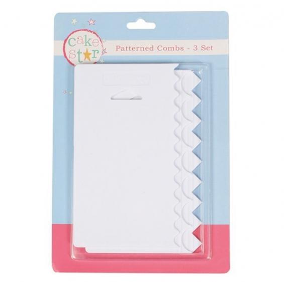 Give your cakes a stylish and professional finish with this set of patterned combs. The combs can be used as a smoother, scraper or to add texture to icings quickly and easily. Includes 3 designs (scalloped, ... Find out more