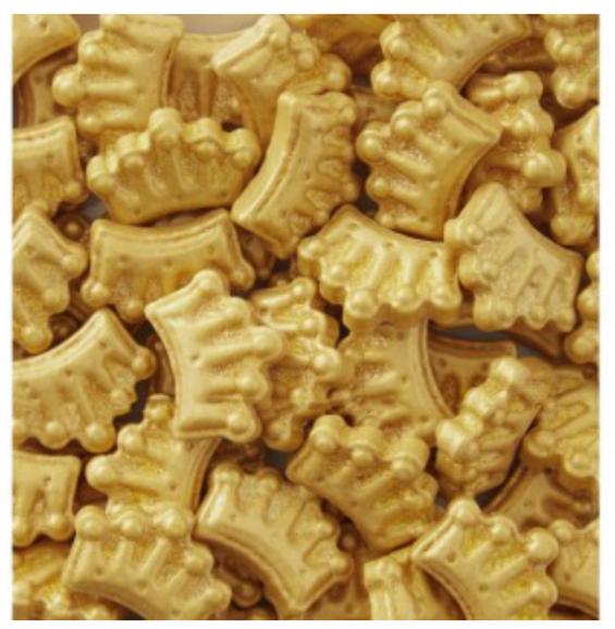 Celebrate birthdays or big matches with these shimmering crown-shaped sprinkles. Use sprinkes or sugars in contrasting colours for a festive display. Includes gold crowns. 56g.