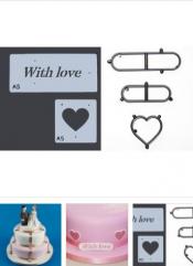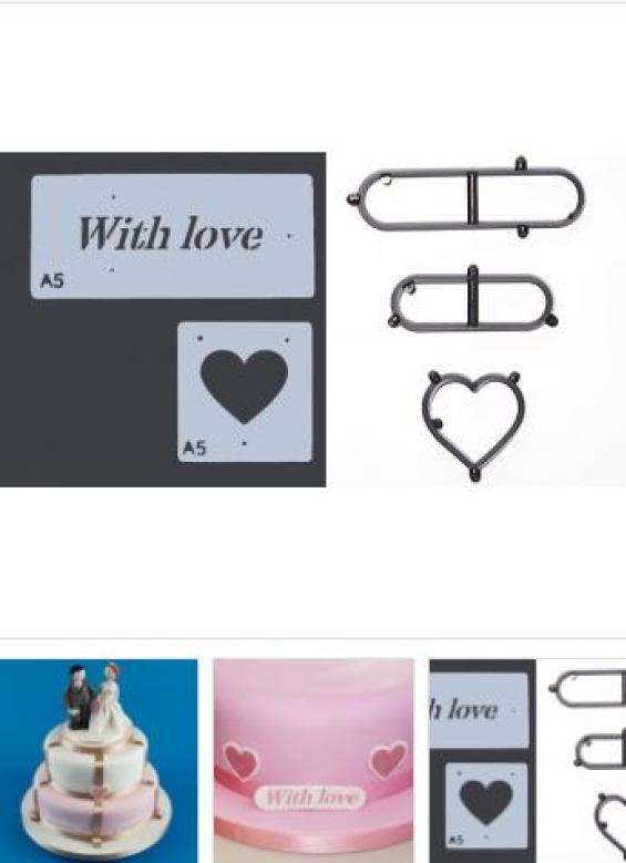 This set includes a heart stencil design and a 'With Love' message stencil. The heart cutter can be used either on its own or with the heart stencil for different designs & would be perfect on a wedding cake. The 'With Love' message is 8.5cm wide.